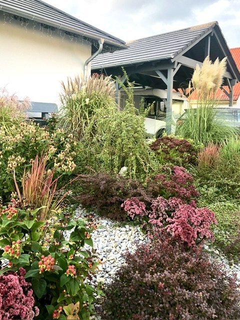 Vorgarten, Herbstfarben, Gräser, Fetthenne, Johanneskraut, Carport