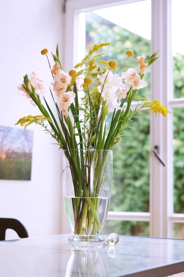 Heute bei mir in der Vase: Gladiolen, Goldrute, Craspedia