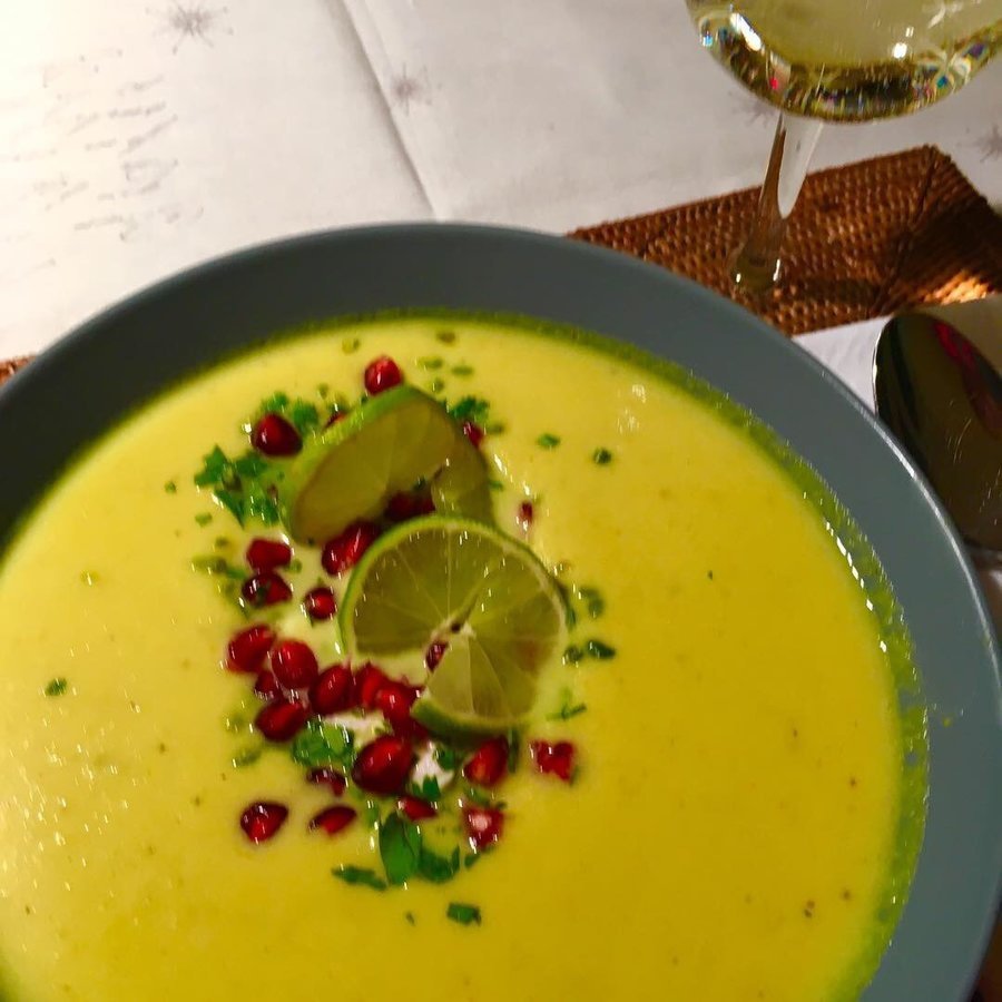 Es gab eine leckere Blumenkohl-Currysuppe mit Ziegenkäse, Koriander, Granatapfelkernen und Limettenscheiben als Topping.