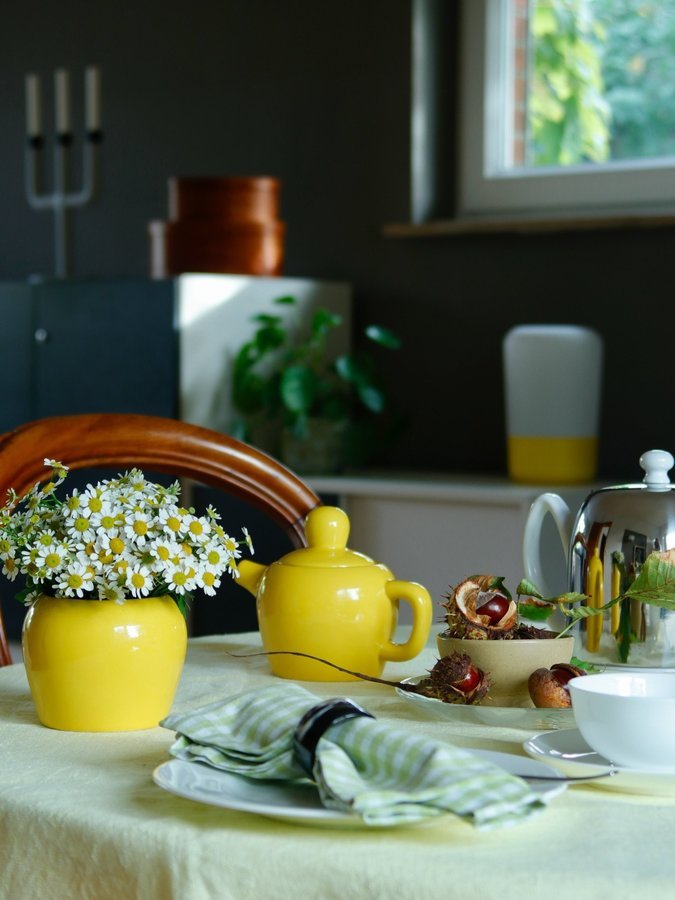 Essbereich, gedeckter Tisch, Geschirr, Akkuleuchte, Gelb, Blumen, Herbst, Herbstdeko