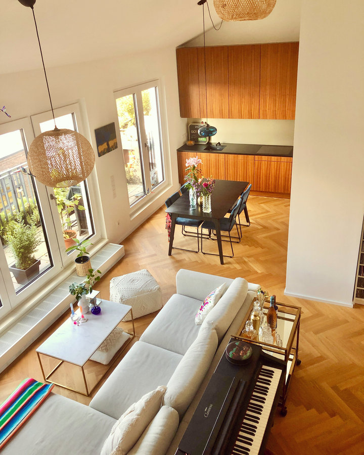 Vogelperspektive, von oben, Wohnzimmer, Wohnzimmer aktuell, Küche, Küche aktuell, Dachgeschoss