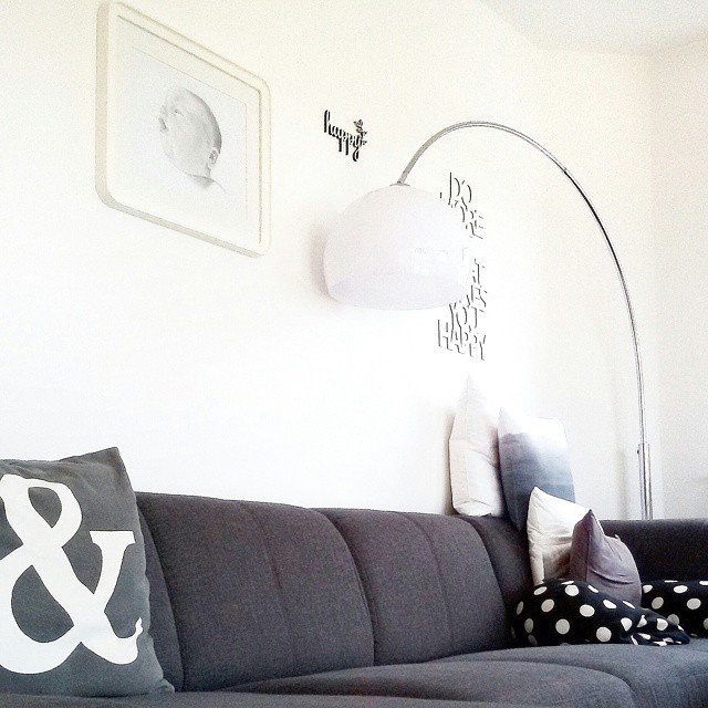 Sofa, Couch, Kissen, Bogenlampe, Wandgestaltung, Dekoration, Dekoration an der Wand, Ahoj2012