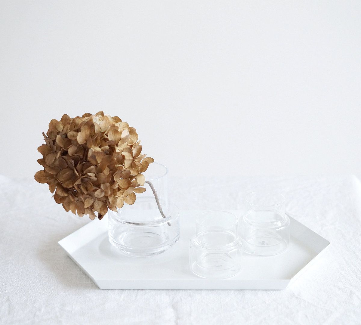 Glasvasen, Tablett, Tischdecke, Hay