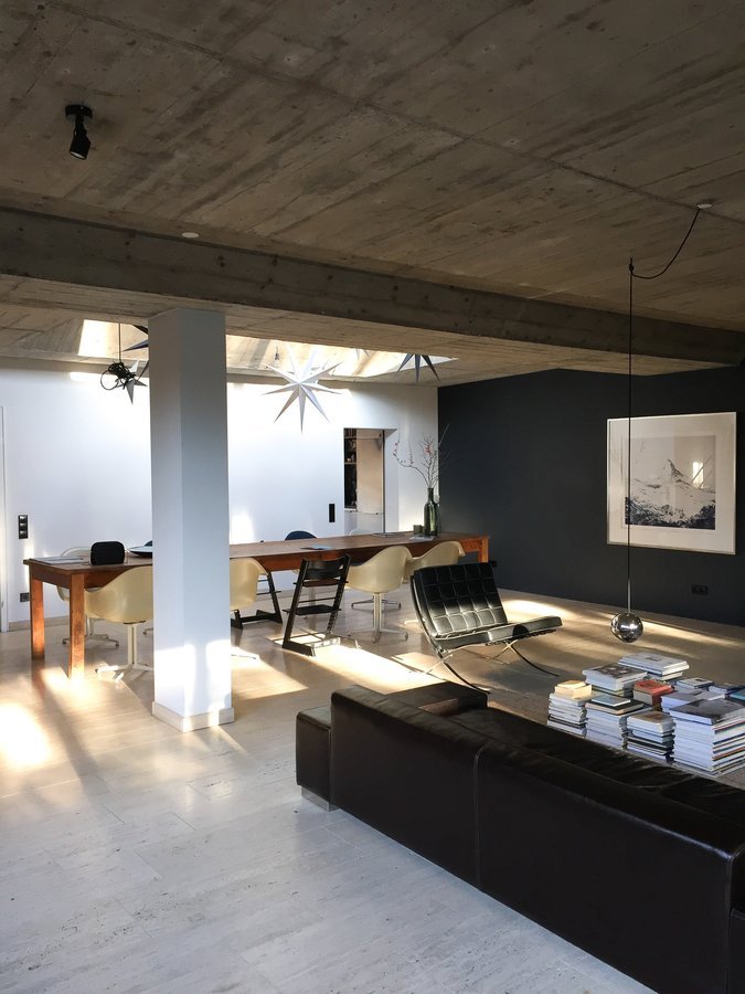 Licht und Schatten, Midcentury, Wohnzimmer, beton, Travertin, Oberlicht, Farrow & Ball