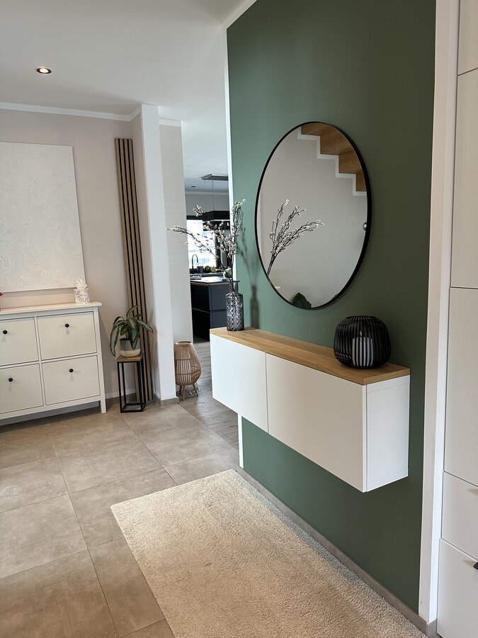 Wandfarbe, Schöner wohnen, Flur, Diele, Spiegel, Kommode, Ikea, Ikea Hack, Ikea Besta, Hausbau, Fliesen, Eigenheim, Innenarchitektur