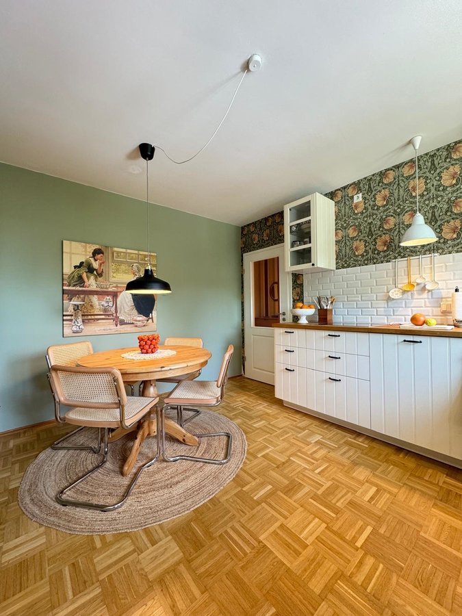 Ich hatte mich sofort in diese Tapete verliebt, mich aber trotzdem nicht getraut, alle Küchenwände damit tapezieren zu lassen. Zwei Wände strich ich in off-white. Drei Jahre lang überlegte ich, was mich in der Küche noch störte. Die hellen Wände sahen so leer aus.