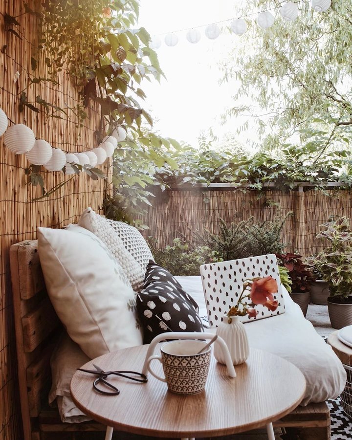 Balkon, Sichtschutz, Gartensofa, Palettensofa, Lichterkette, Gartenmöbel, Boho Chic