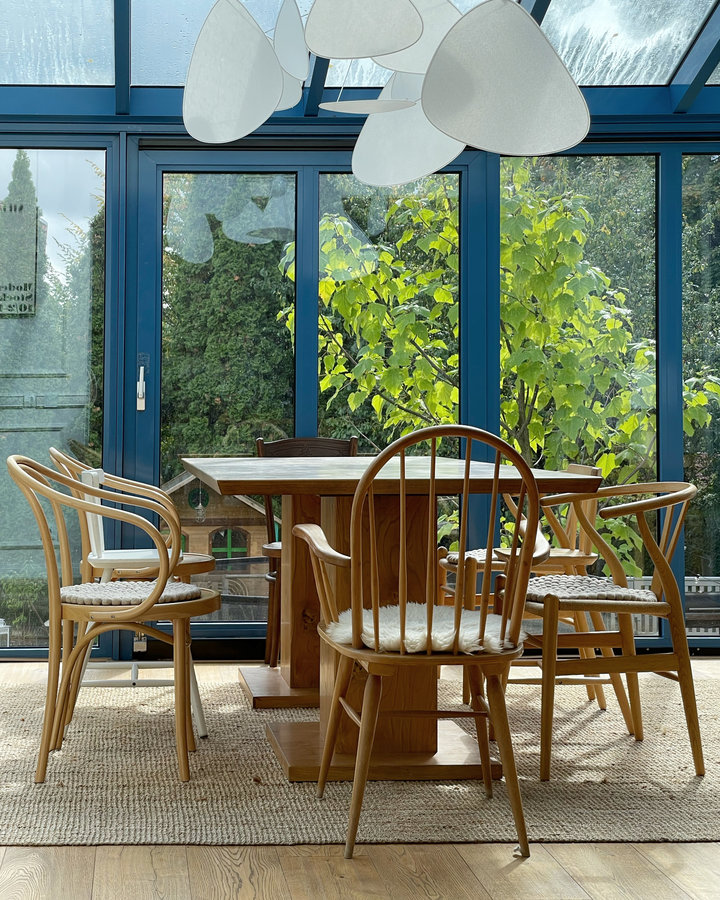 Wintergarten, Essbereich, Esstisch, licht, Garten, Holztisch, Juteteppich