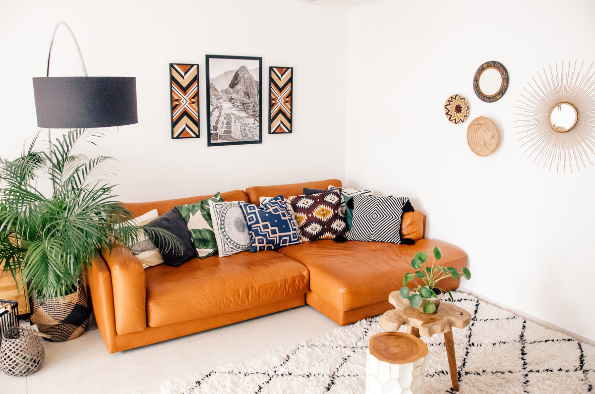 Bohostyle, Boho Chic, Boho, Bohostil, Ledersofa, Teppich, schwarz weiß, Körbe, Wandbild, Wanddeko, Wanddekoration, Zimmerpflanzen, Beistelltisch, Holzmöbel, Fliesenboden, Eiche, Sideboard, Wandpaneele, Ethno, Ethnostyle, Pflanzenkorb, Kissen, Bogenlampe, Stehleuchte, Stehlampe, Sonnenspiegel, Wandspiegel, Korbwand, Galeriewand, Gallery Wall, Hygge, Machu Picchu