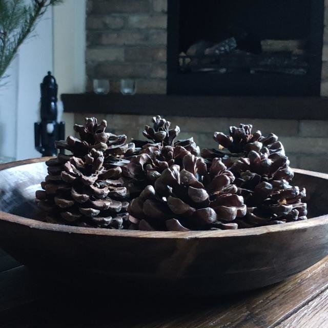 Ich liebe natürliche, rustikale Deko. Hier stehen schöne große Pinienzapfen in einer Holzschale. Der Nussknacker im Hintergrund ist - passend zum Farbkonzept zu Hause - schwarz angemalt.