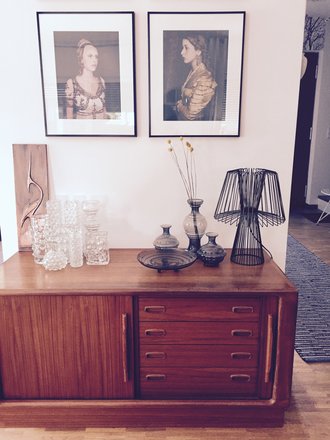 Vintage vasen, Vintage Lampe, 60er, Schwarzweiss, Wand zwischen Flur und Küche, eins von fünf Teaksideboards, neue Beine