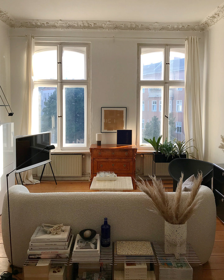 Wohnzimmer, Altbau, Sofa, Kommode, Fernseher, Pampasgras, Stuck