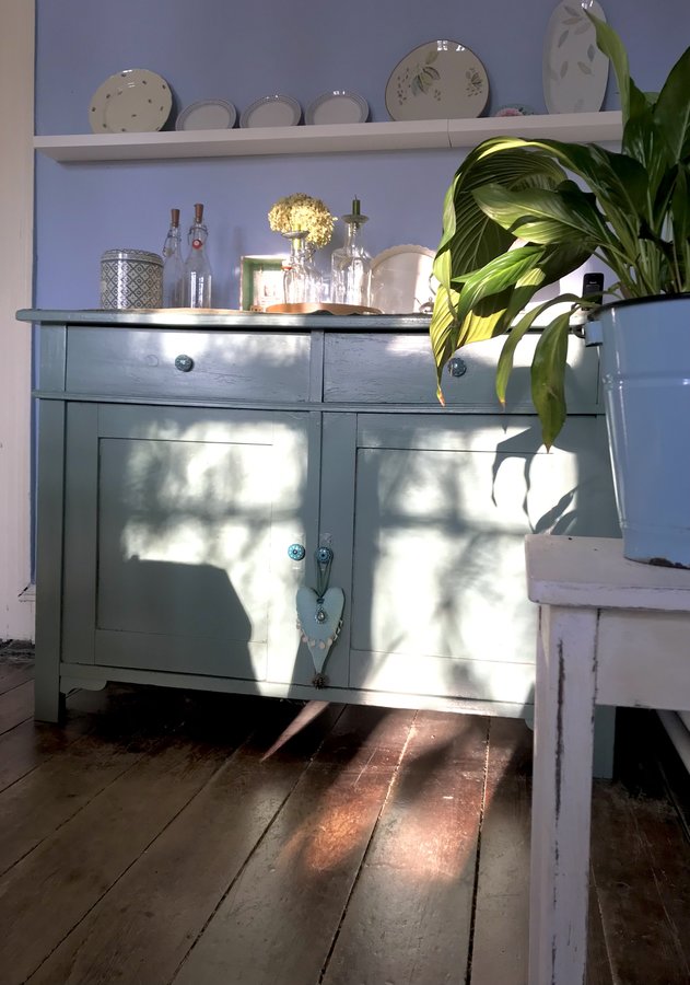 Im Sonnenlicht - meine Lieblingskommode, Schuppenfundstück , neu gestrichen in Salbei hat sie einen neuen Platz im Esszimmer gefunden. Sie beherbergt die Vasensammlung und anderen Dekokram.