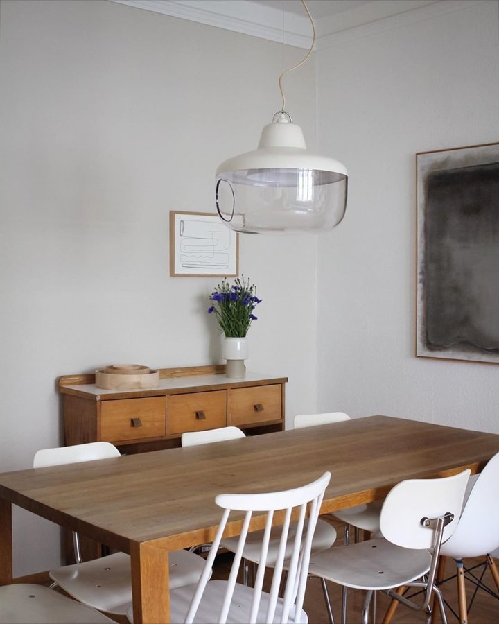 Esszimmer, Esstisch, Holztisch, Esszimmerstühle, Stuhlmix, Hängeleuchte, Wandfarbe