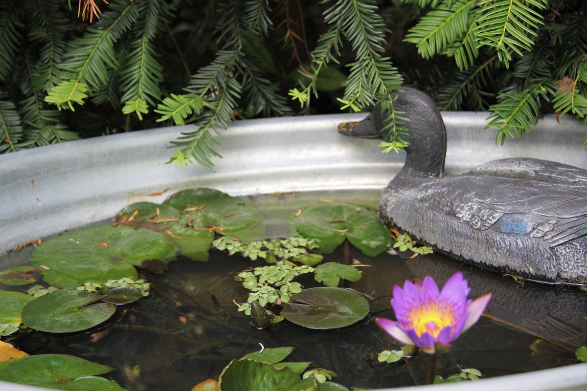 In Ermangelung eines Gewässers muss die Seerose in der Zinkwanne ihr Dasein fristen. Behütet von der Holzente macht sie das aber ganz gut.