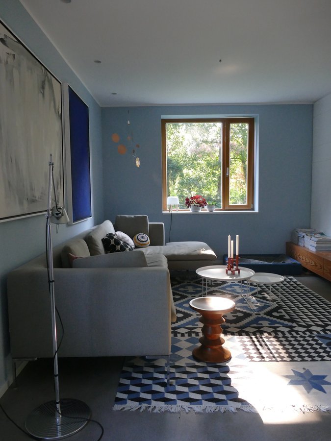 In unserem Wohnzimmer weht ein frischer blauer Wind. Ich mag ja sehr gerne Farbe an den Wänden, bin da aber wegen der vielen Bilder, die wir haben immer etwas zurückhaltend. Das Wohnzimmer brauchte dringend eine Änderung - es war mir viel zu kühl, obwohl der Raum nur recht klein ist und schon viel Farbe dort passierte. Was tun? Noch mehr Farbe!!!! Der Teppich wanderte kurzzeitig mal raus aber der alte kam wieder rein, weil er einfach so schön ist und sehr stimmig. Holz musste her und mit dem Eames-Stool erfüllte sich ein jahrelang gehegter Traum. Ich finde der bringt schon ganz viel Atmosphäre.... Und dann wurde das Zimmer gestrichen und als I-Tüpfelchen kam noch das Mobile in Kupfer dazu, dass die Farbe der Fenster wieder aufgreift. Was meint ihr? Gelungen?