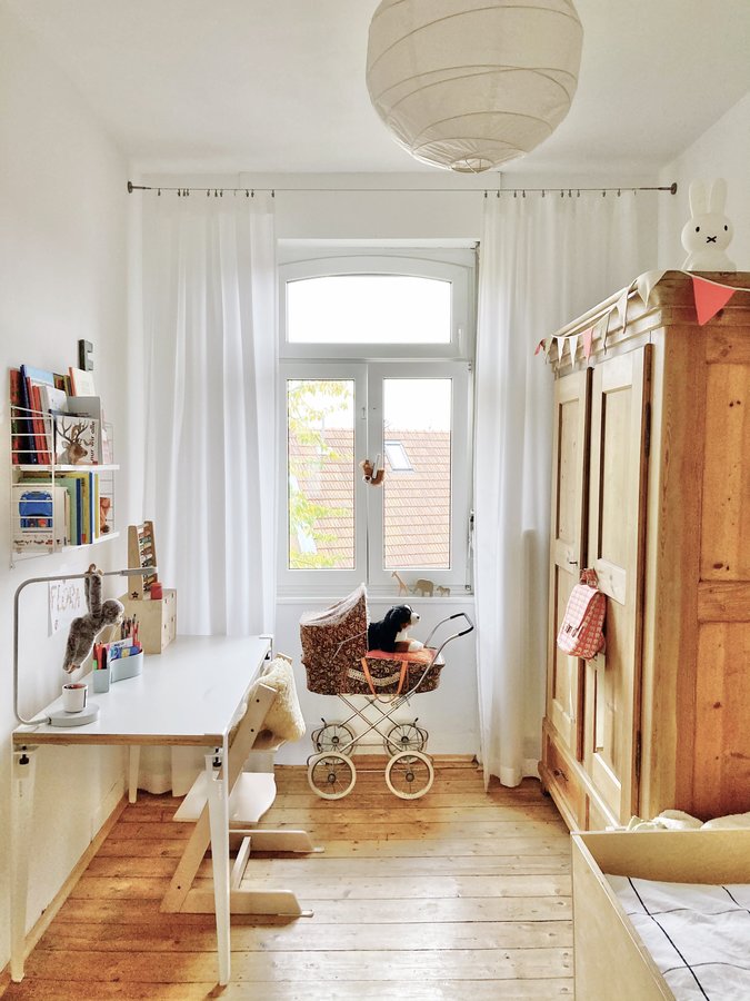 Kinderzimmerdeko, Kinderzimmer, Altbau, Altbauliebe, Dielen, Kleiderschrank, Lampe, Vintage Deko, Vintage, Bücherregal, Schreibtisch