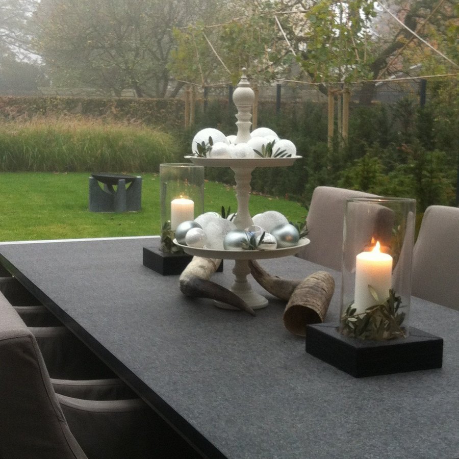 Ich habe nach einer schönen Idee gesucht um die Terrasse winterlich zu gestalten ohne sie mit Kitsch zu überladen. In der Landlust kam ich dann auf die Idee Olivengrün zu kombinieren mit kalt farbenen Kugeln. Die Etagere ist Vintage die Windlichter habe ich vor Jahren mal von FINK gekauft die sind aber glaube ich nicht mehr im Sortiment. Im Hintergrund sieht man einen alten Olivenbaum der mit Lavendel unterpflanzt wurde und ein großes Feld von Pfeifenputzergraß. In meinem Garten wachsen nur sehr wenige Pflanzen. Es ist leider so dass man sehr konsequent sein muss wenn man einen bestimmten Silt halten und verfolgen will. Mich juckt es oft in den Fingern und ich würde am liebsten 1000 von Rosen und Blühenden Sträuchern kaufen aber das würde die Aura des Gartens zerstören.