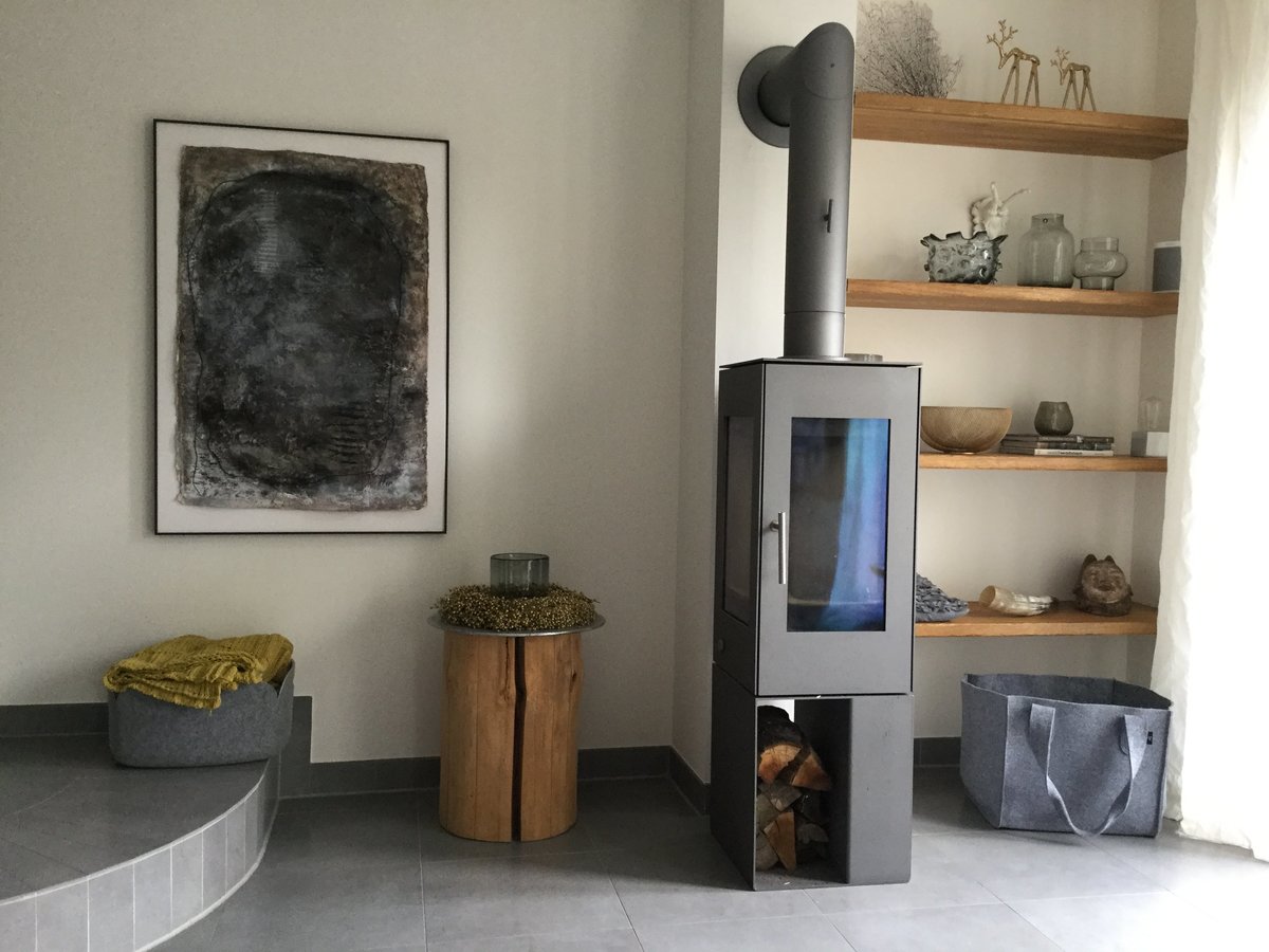 Regal, Kamin, Kunstwerk schwarz, Holzstumpf, Grau, Weihnachtsdeko