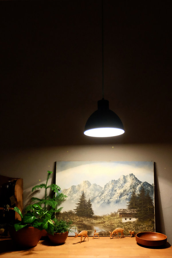 Gemälde, Pflanzen, Küche, Dekoration, Industrielampe, Textilkabel, Holzgefäß, Holztiere, Arbeitsplatte, Holzregal