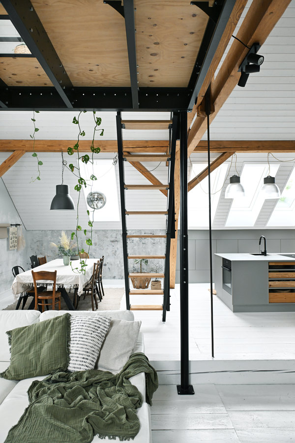 Essbereich, Kochen, Küche, Kochinsel, Loft, Kissen, Industrial, Dachbalken, Dachschräge, Ikea, Dachfenster, Velux