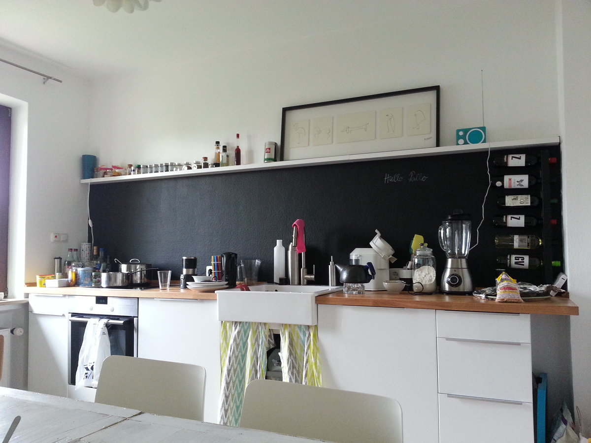 keramik becken, schwarze Wand, tafel lack, vollholzarbeitsplatte in eiche, Wandgestaltung