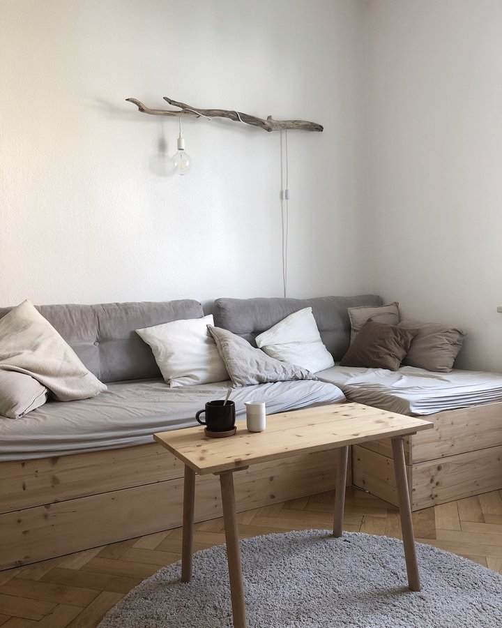 Sofa, Couch, Diy, selbsgtebautemöbel, Holz, Naturtöne, Wohnzimmer, Wohnzimmerideen, Minimalistisch, Treibholz, Treibholzlampe, Kaffeepause
