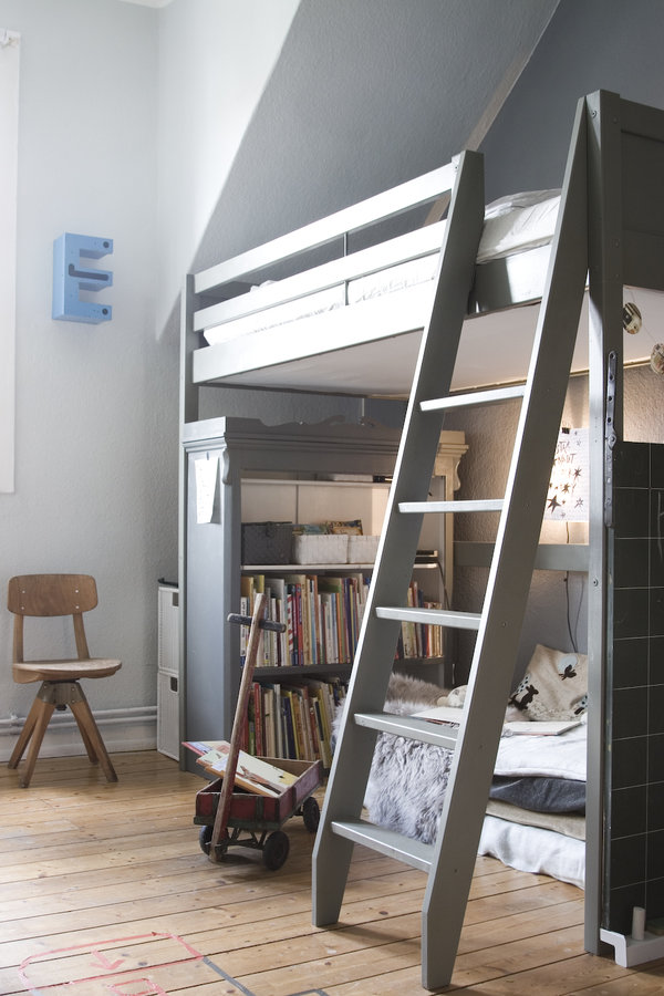 Das Gewünschte Hochbett ist ein bei Ebay ersteigertes und selbst gestrichenes Ikea Bett, die leider nicht mehr im Sortiment ist. Unten entstand eine Kuschel-und Leseecke. Das Regal fand ich mal vor Jahren im Sperrmüll. Die gelesenen Bücher wandern in den alten kleinen Holzwagen. Hinter dem Bett unter der Schräge bietet die sonst tote Ecke eine gute Möglichkeit Spielzeugkisten aufzubewahren.