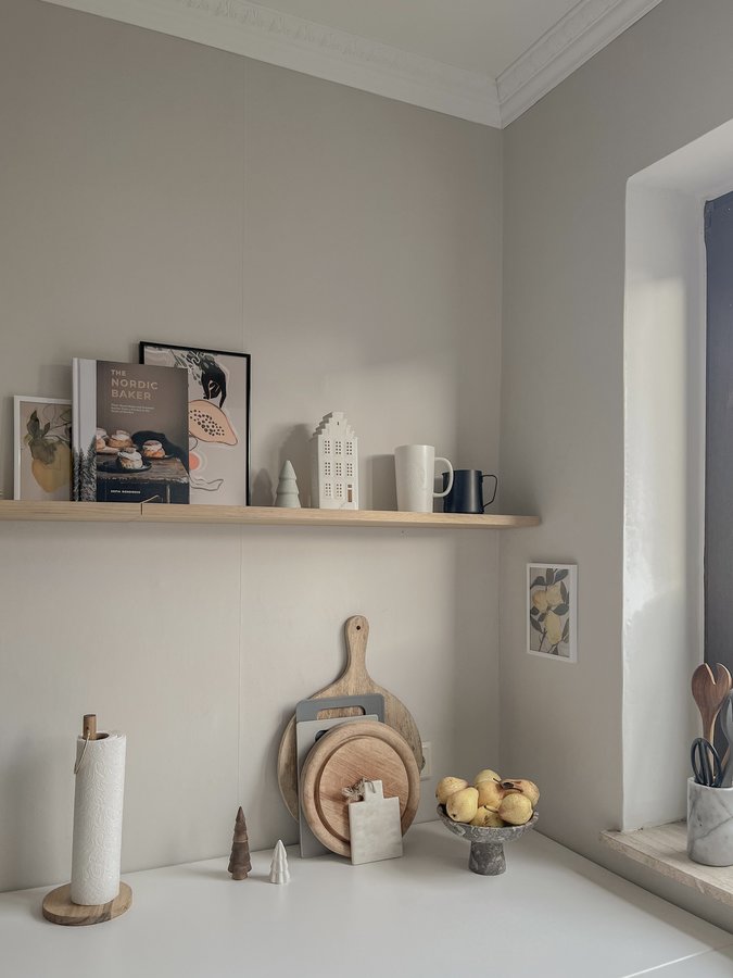 Küche, Küche Altbau, Altbau, Ikea, Ikea Küche, Weiße Küche, Wandfarbe Beige, Wandfarbe Grau, Stuck, Küchenregal, Regal, Bilder, Poster, Tablett, Weihnachten, Weihnachtsdeko, Tassen, Etagere, Schale