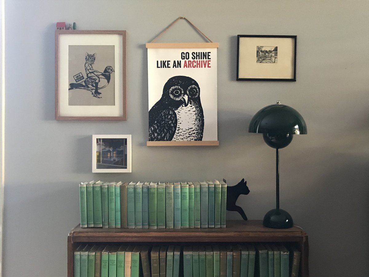 Als wir unsere Büros ins kleine Haus am Rande der Stadt verlegen mussten, stapelten sich die Bücher überall. Ich habe ein kleines oranges Regal abgeschliffen und da sitzen jetzt die alten Griechen meines Mannes. Darüber befinden sich Bilder, die ich auf Reisen gesammelt habe. Das kleine Bild, das aussieht, als schaute man durch ein Fenster auf die Dächer von Paris, oder die Katze vom Weihnachtsmarkt in der Sophienstraße in Berlin...