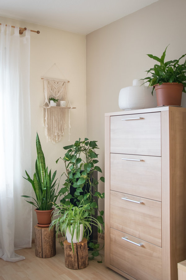 Wohnzimmer, Greige, Pflanzen, Makramee