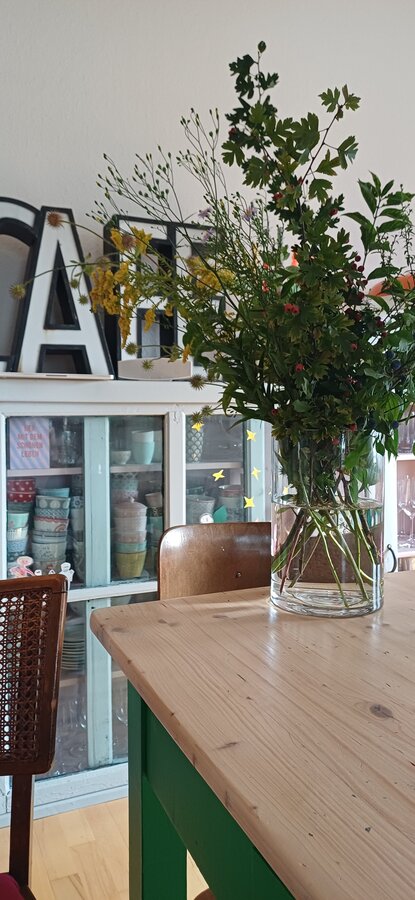 Wildblumenstrauß, Grüner Tisch, Vitrine, Leuchtbuchstaben, Wiener Geflecht, Greengate, Kinderkunst