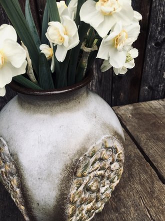 Altholz, Garten, Narzissen, Midcentury, Keramik, Vase, Gartenhütte