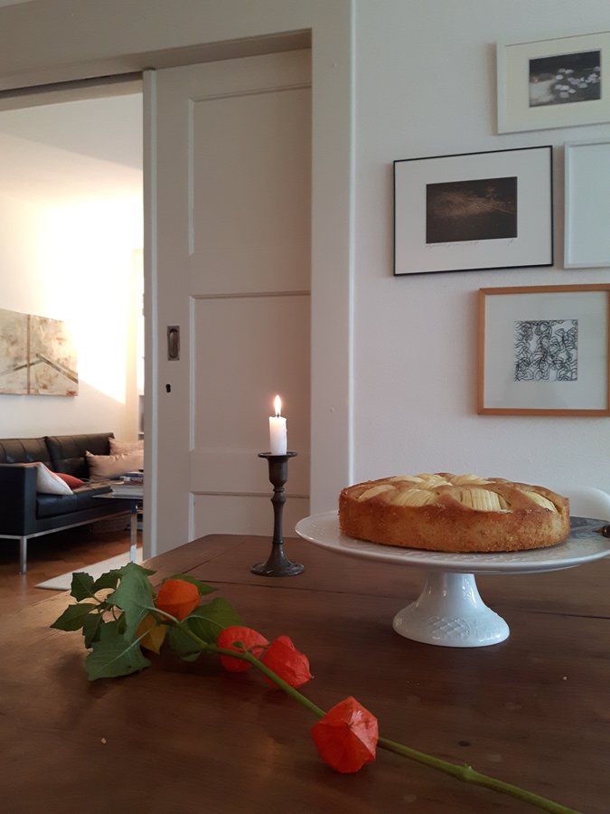 Selbstgebackener Apfelkuchen, Lampionblumen, Altbau, Schiebetüren, Sofa de Sede, Ölbilder, Kunst, Bilderwand, Diy, Herbst