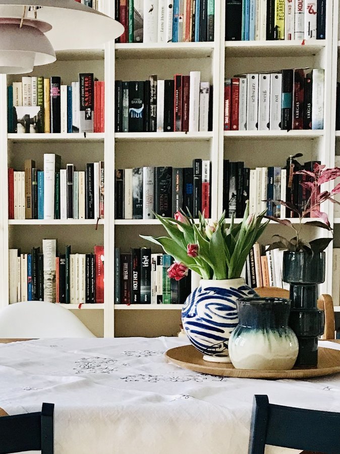 Lektüre, Esszimmertisch, Bücherregal, Blumen und Vasen