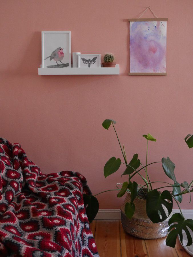 Sofa, Granny Squares, Monstera, Korb, Rosa, Vogel, Wandfarbe Rosa