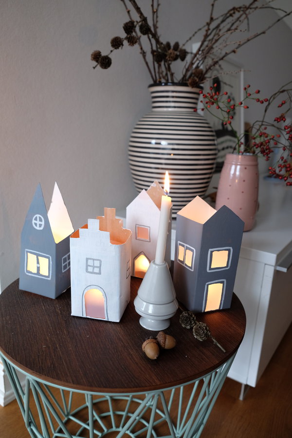 Sankt Martin kommt mit großen Schritten: Wie immer stellen wir unsere Milchtütenhäuser auf, die Straße wächst mit jedem Jahr um ein Häuschen.