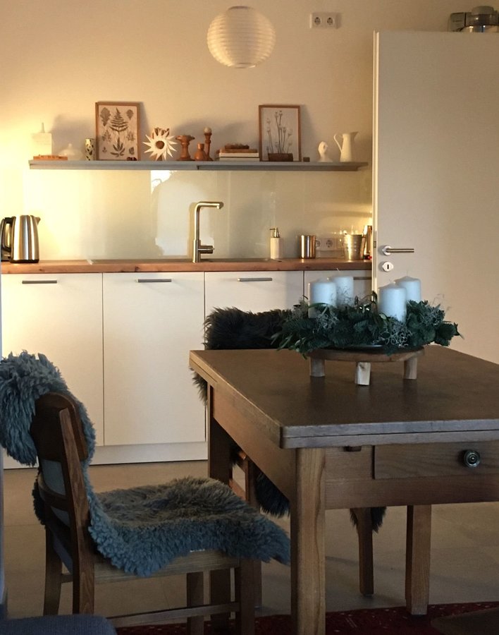 Küche, Holztisch, Holzstühle, VordemAdvent, Advent, Adventskranz, Adventskranzglanz, Schaffell, Stern, Freitagsruhe, homeoffice, Kaffeepause, Vier Kerzen, Kerzen, Weiße Kerzen, Klassisch, Holz, Küchenmodule, Lichtboard, Board, Küchendeko, Dekoration, Braun, Weiß, Istmehrweniger, Sonnenglanz, Umzug, Neubau, Erdwärme, Erstes Jahr, Jahresverlauf, Sonnenverlauf, Sonnenstand, Adventsdeko, Winterstimmung, Winterdeko, Adventszeit
