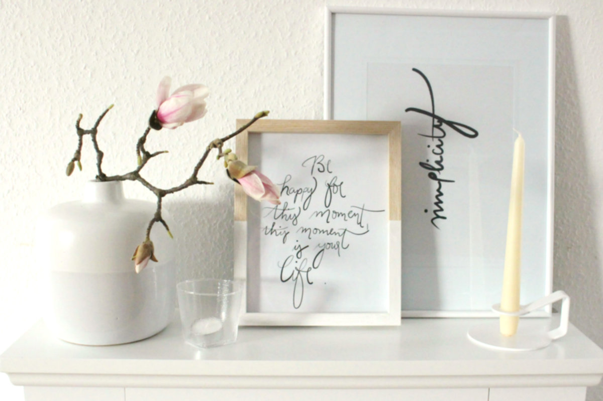 Kaminsims, Regal, Frühling, Bilder Bord, Bilder, handlettering, Magnolie, Stilleben, wohnen in weiss, Dekoration, Inspiration