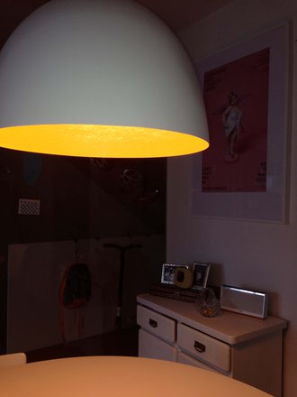 Esstisch Sheesham Holz, Lampe weiß mit Kupfer
