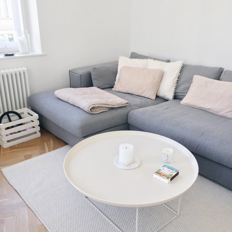 Graue Couch, Muuto, Norr11, Wohnzimmer, Atbau, Fischgrätparkett, White Living, Simple Living, Skandi