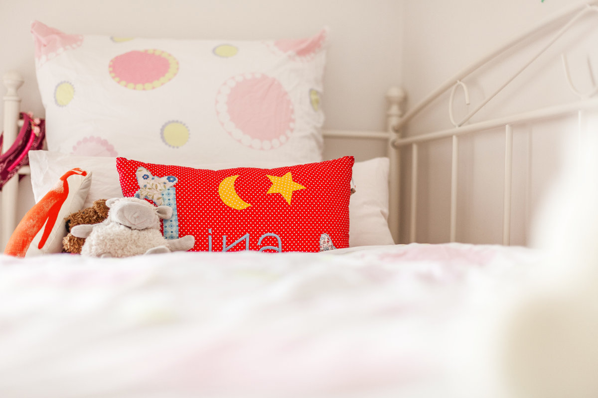 Namenskissen, Kuscheltiere, Eisenbett, weiß rosa Bettwäsche