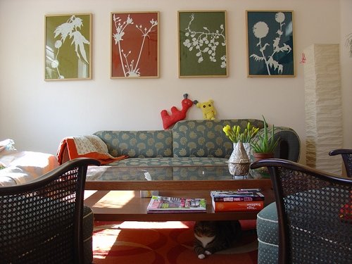 Die Bilder an der Wand sind gerahmte Geschirrtücher von Ferm Living. Die kleinen Monster sind selbstgemacht, Diwan und Sessel von ebay.