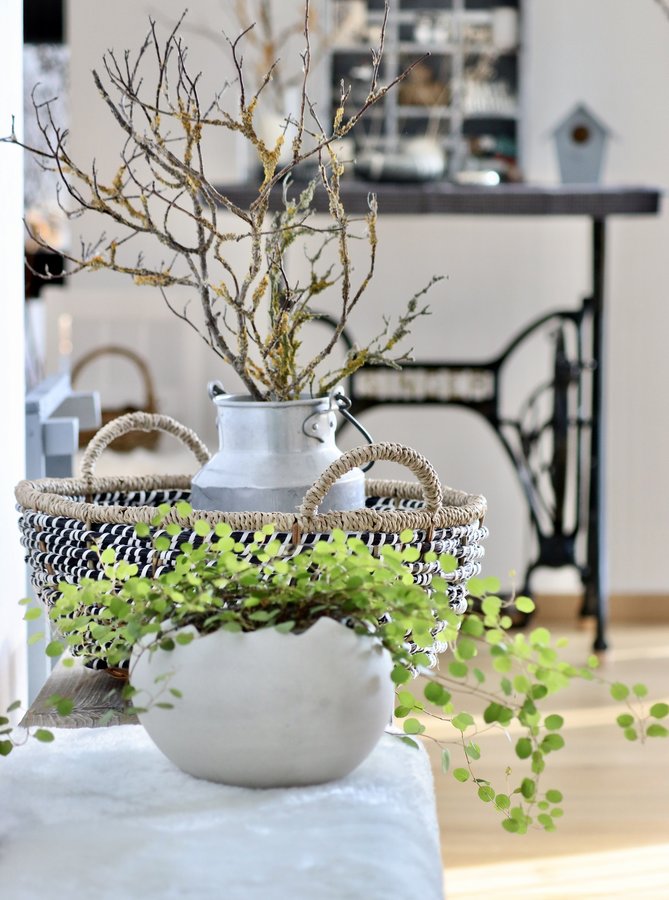 Maigrüner Drahtwein, Bank, Singergestell, Milchkanne, Asttick, Korb, Wohnraum