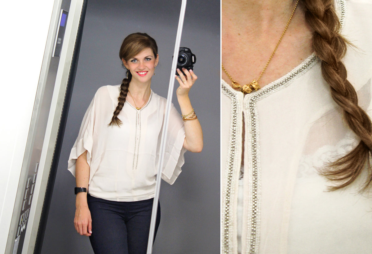 Das Schmetterlingstop ist echt schön verarbeitet, der Stoff knittert kaum, hat kleine Pailletten oben am Kragen und das schönste ist, dass der Schnitt sehr weit, unten am Bund aber wieder sehr eng ist. So sieht man von der Seite nicht aus wie ein Sack