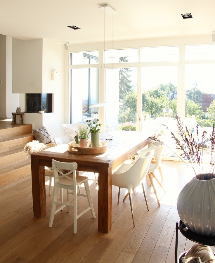 Wohnbereich, Esstisch, Essbereich, Gaskamin, Juli, Sommer, 2020
