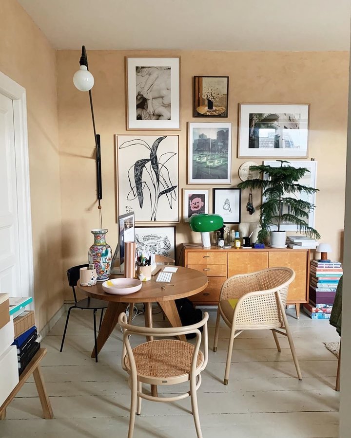 Esszimmer, Esstisch, Runder Tisch, Esszimmerstühle, Stuhlmix, Wandfarbe Beige, Wandgestaltung, Bilderwand, Kunst, Bilder aufhängen