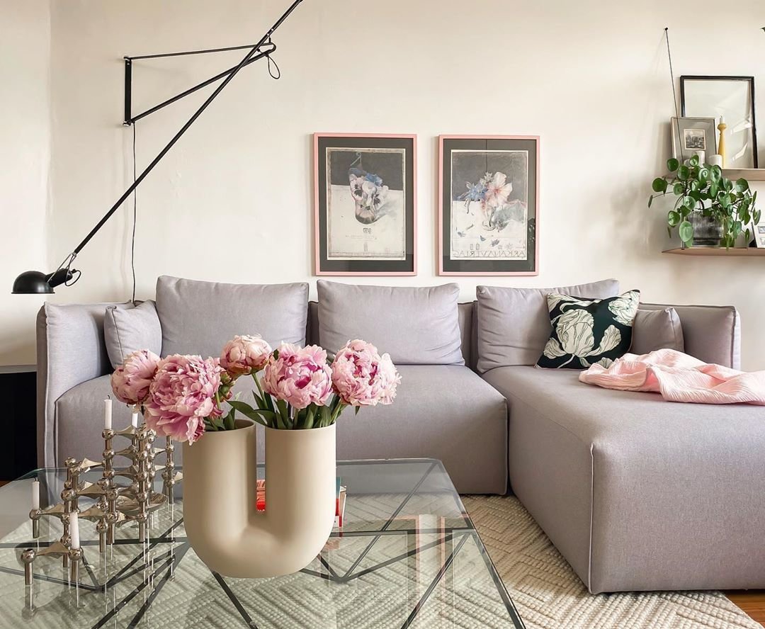 Wohnzimmer, Sofa, Ecksofa, Wohnzimmertisch, Vase, Blumen, Pfingstrosen, Kink Vase