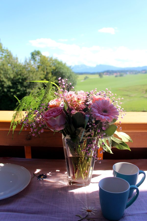 Blumenstrauß, Rosen, Balkon, Geburtstag, Ausblick, Berge, Tassen