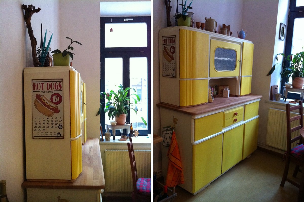 Mein selbst restauriertes Buffet. Habe ich vor Jahren für 23 Euro bei ebay ersteigert. Die Rückwand und der Boden mussten erneuert werden. Außerdem hat es passend zur Küchenarbeitsplatte eine neue Holzplatte bekommen. In der Mitte musste eine neue Glasscheibe eingesetzt werden. Links unten ist noch das Emaillefach für das Aufbewahren von Brot erhalten und auch das Fach mit Setzkasten war noch drinn. Glasschuber musste ich jedoch auf dem Flohmarkt und bei ebay passende zusammensuchen.